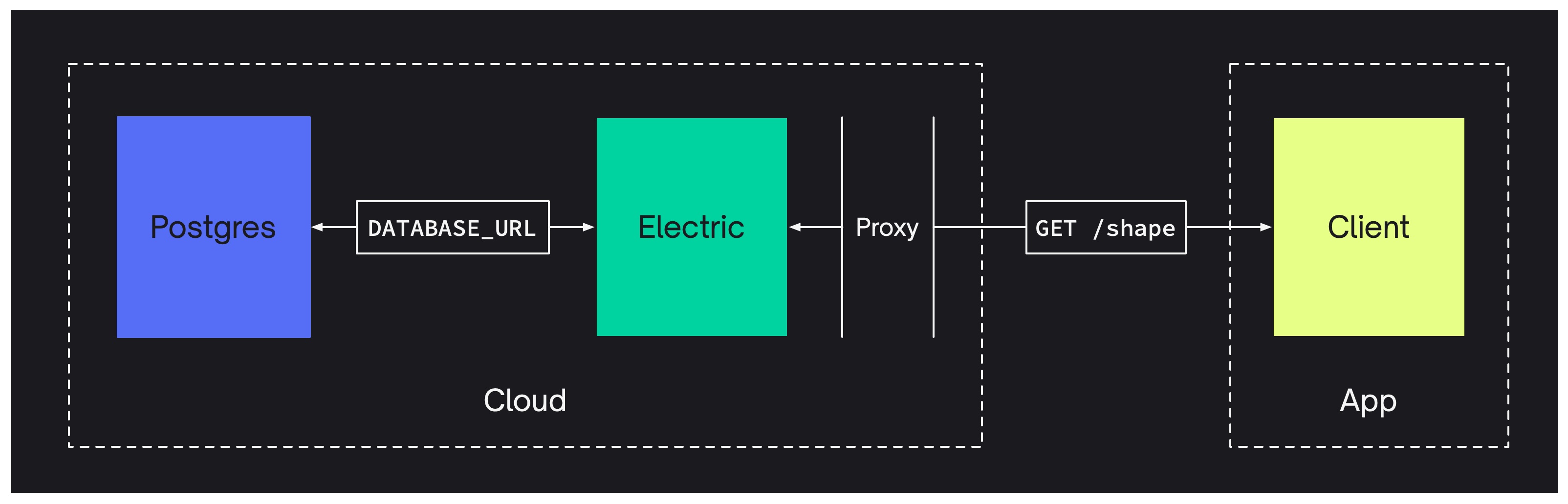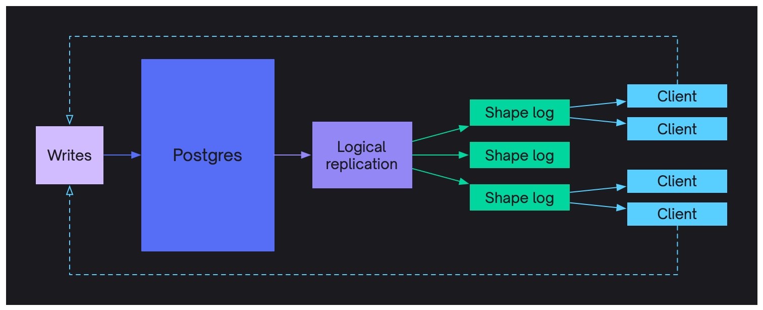 Postgres Sync connects to your Postgres using a DATABASE_URL, consumes the logical replication stream and fans out data into Shapes, which Clients then consume and sync.